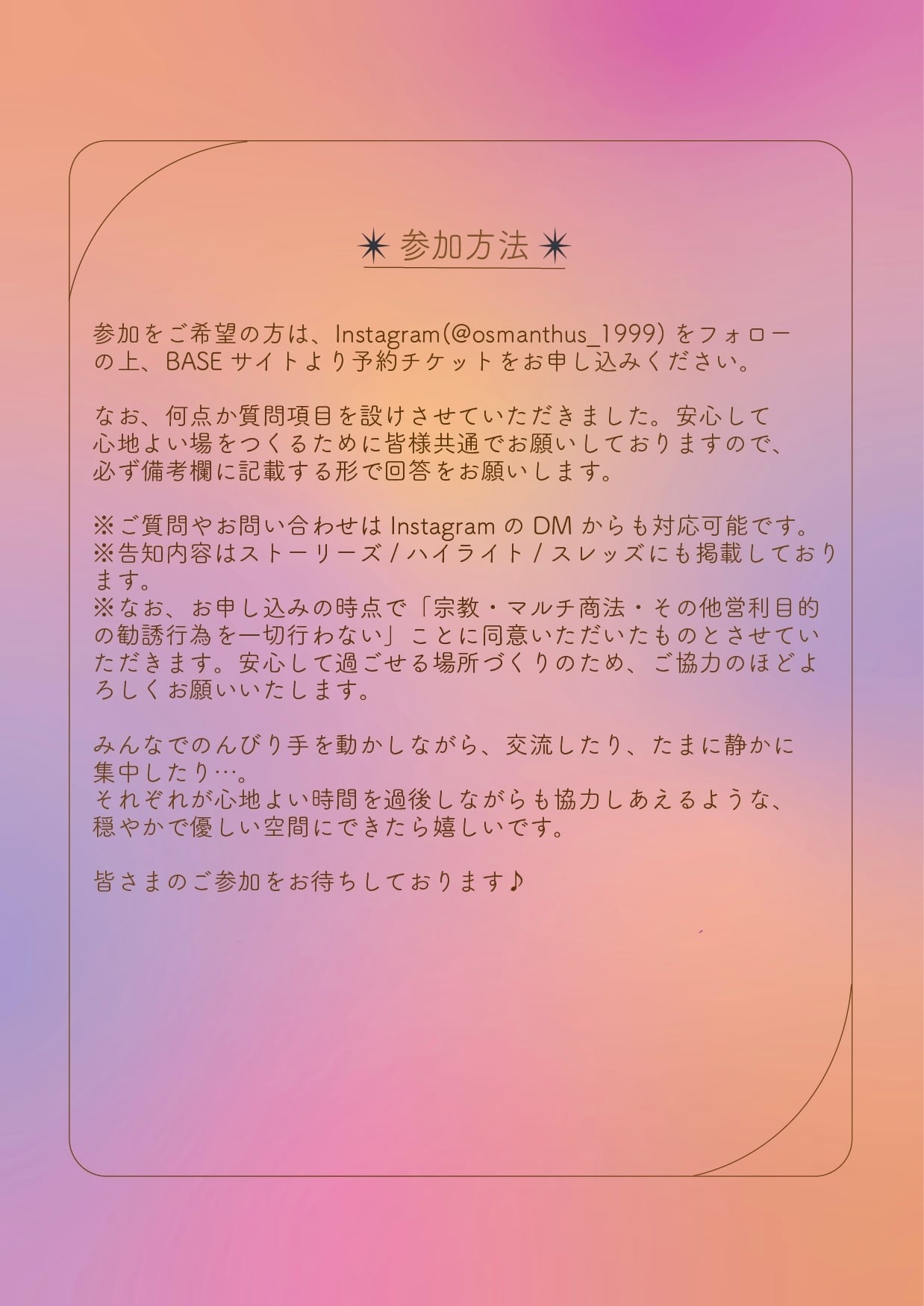 Instagram(@osmanthus_1999)をフォローのうえ、BASEサイトより予約チケットをご購入ください。