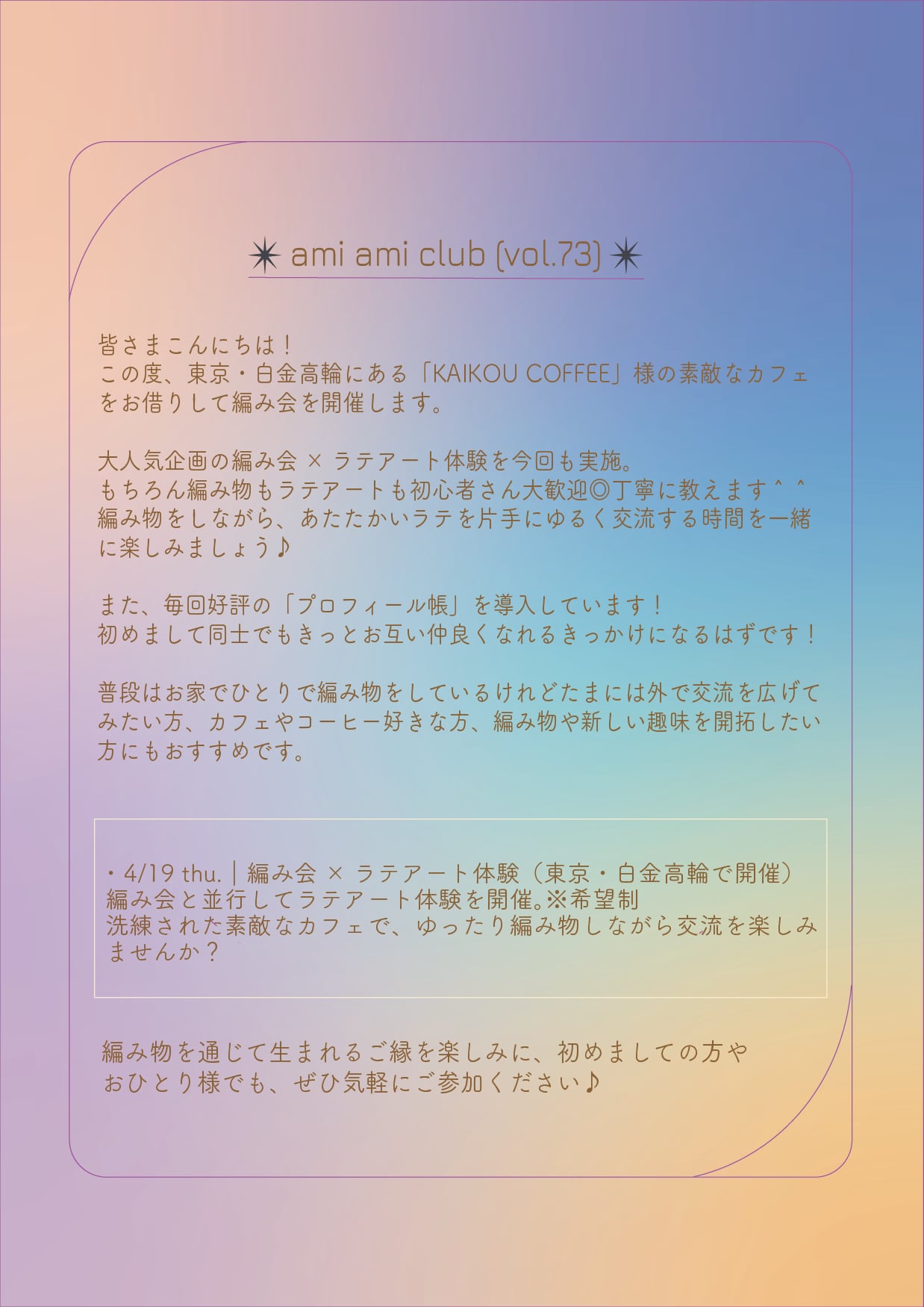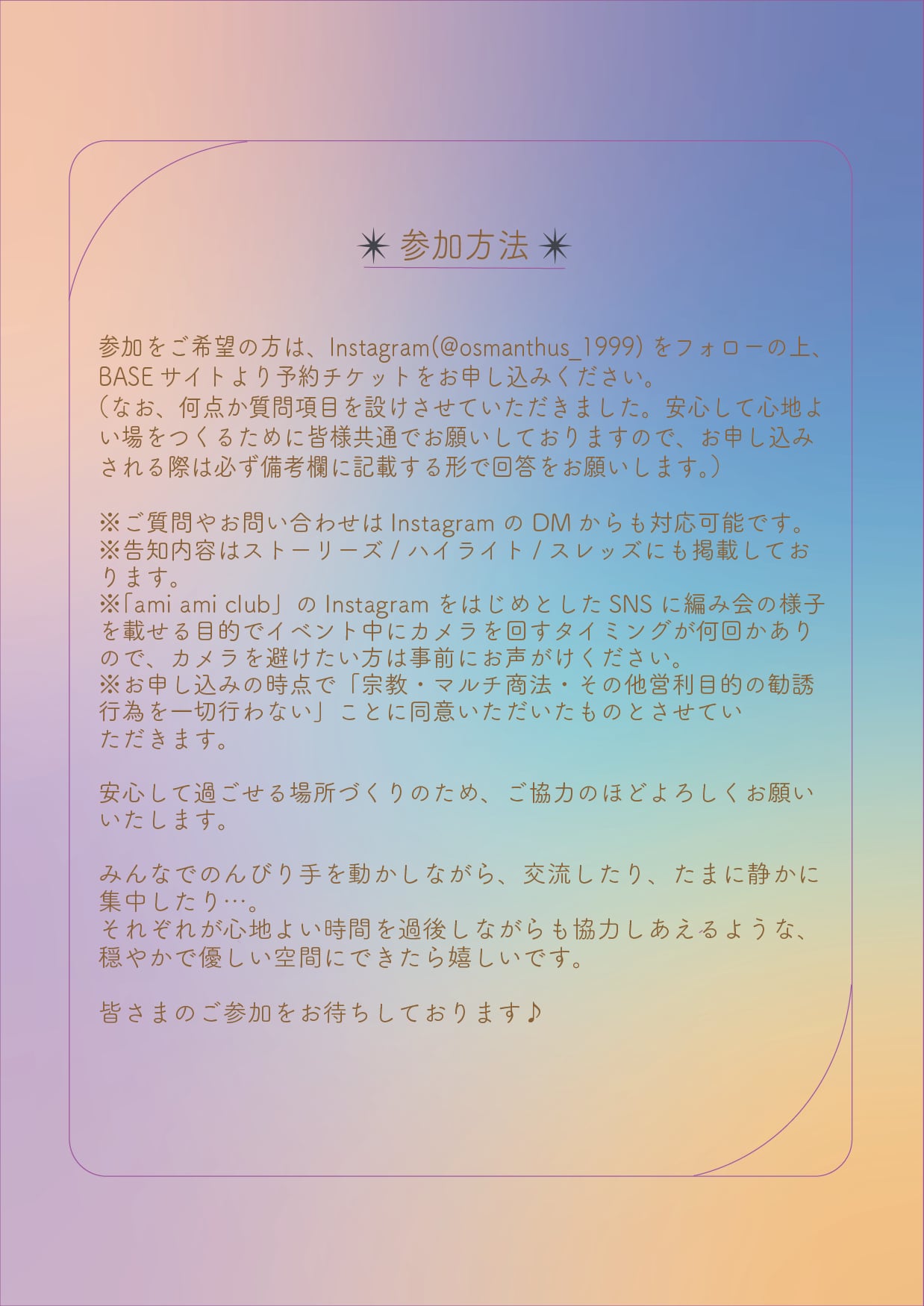 ※ ami ami club」のInstagramをはじめとしたSNSに編み会の様子を載せる目的でイベント中にカメラを回すタイミングが何回かありので、カメラを避けたい方は事前にお声がけください。