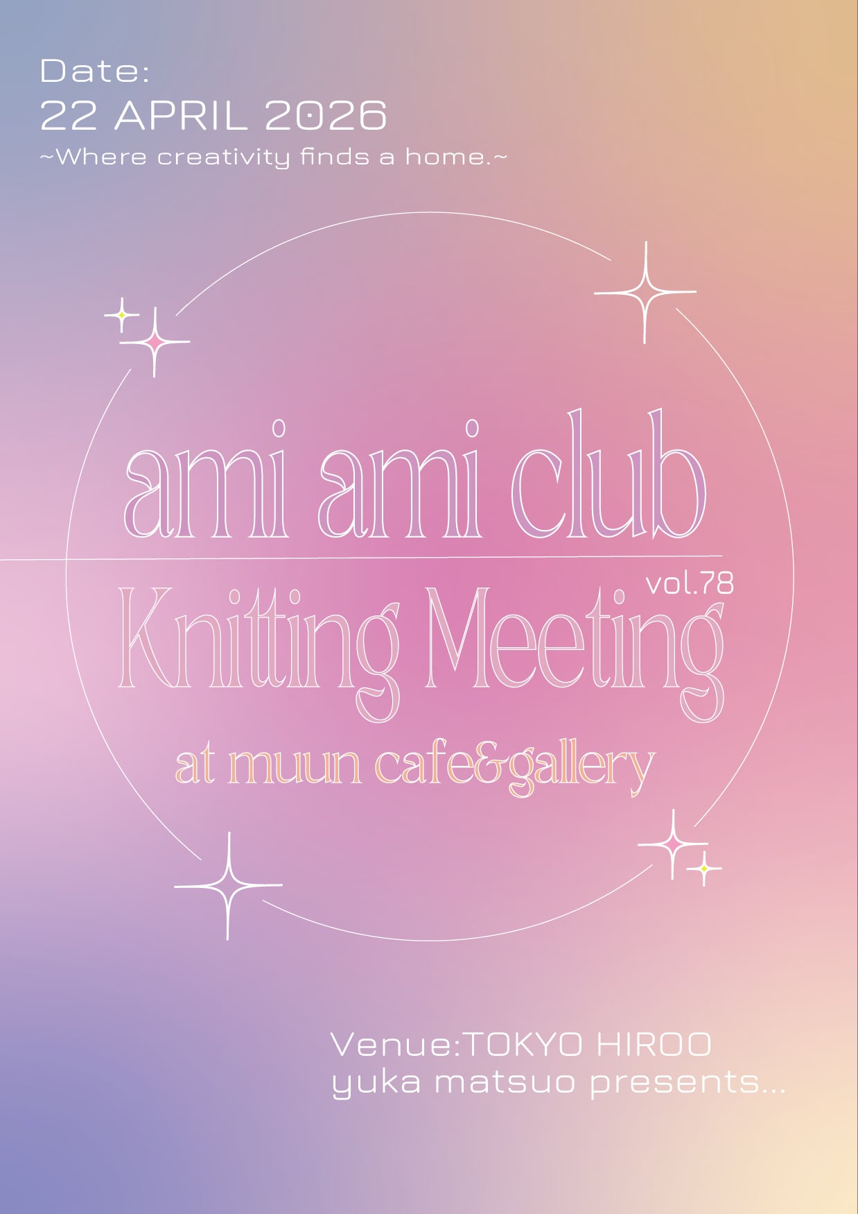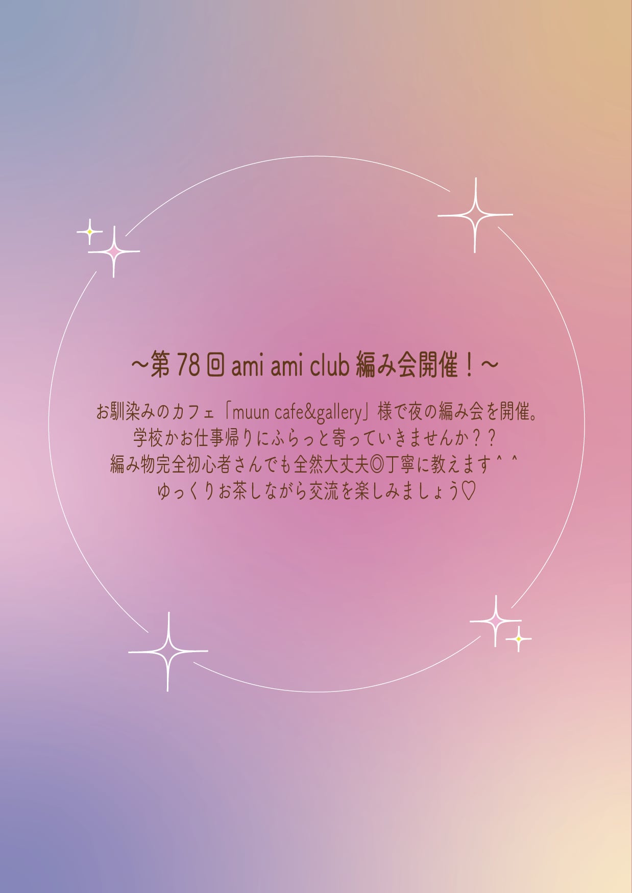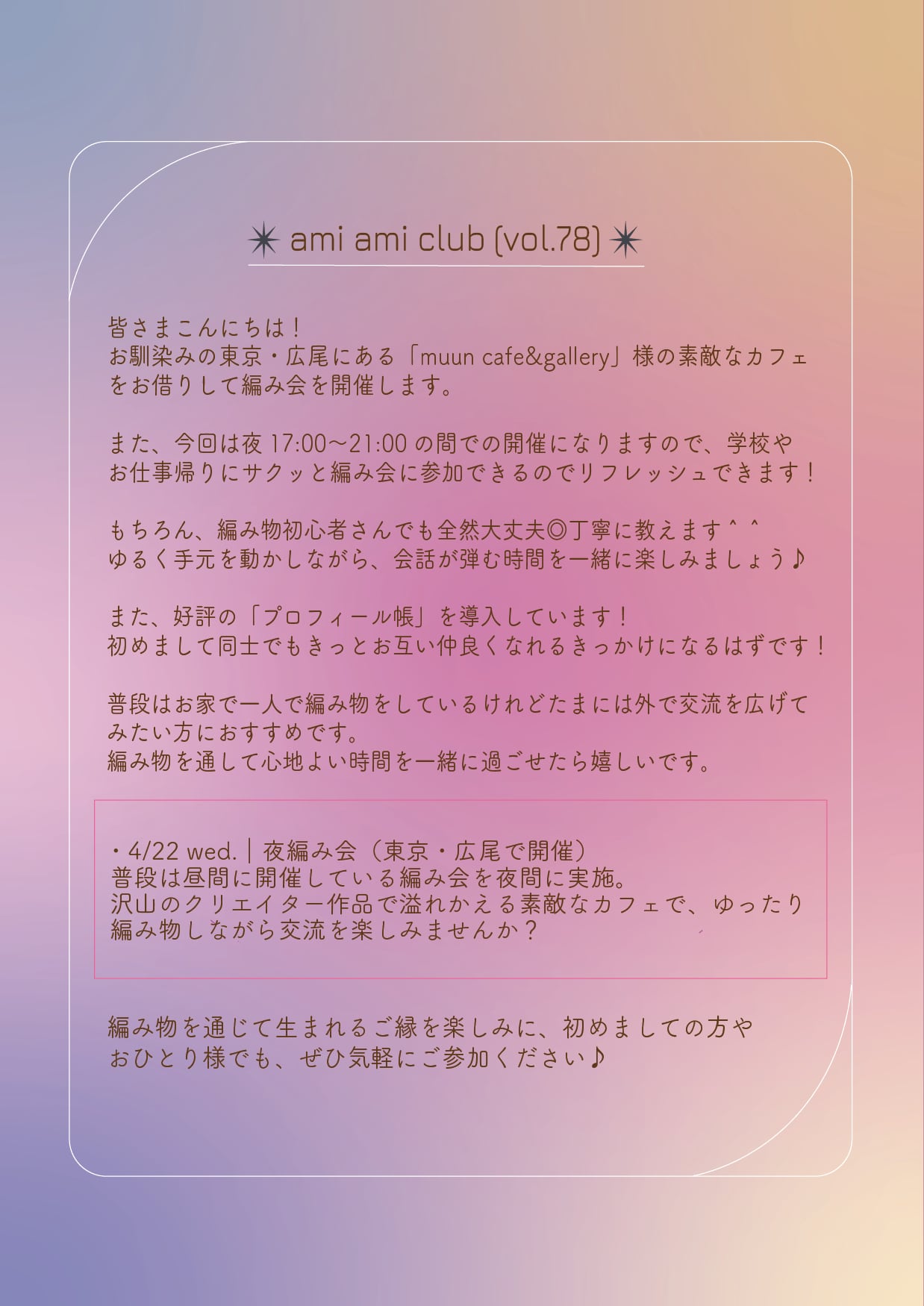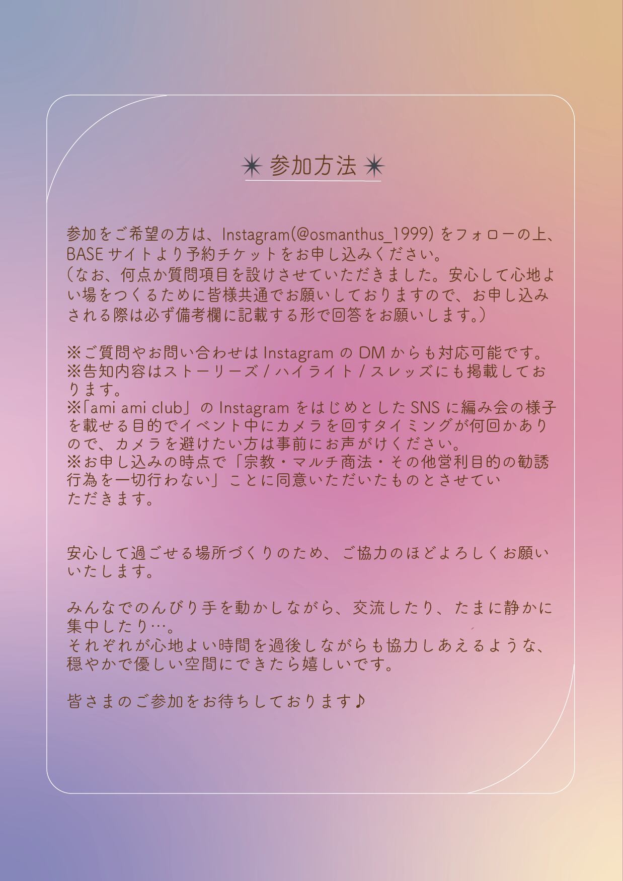 ※ ami ami club」のInstagramをはじめとしたSNSに編み会の様子を載せる目的でイベント中にカメラを回すタイミングが何回かありので、カメラを避けたい方は事前にお声がけください。